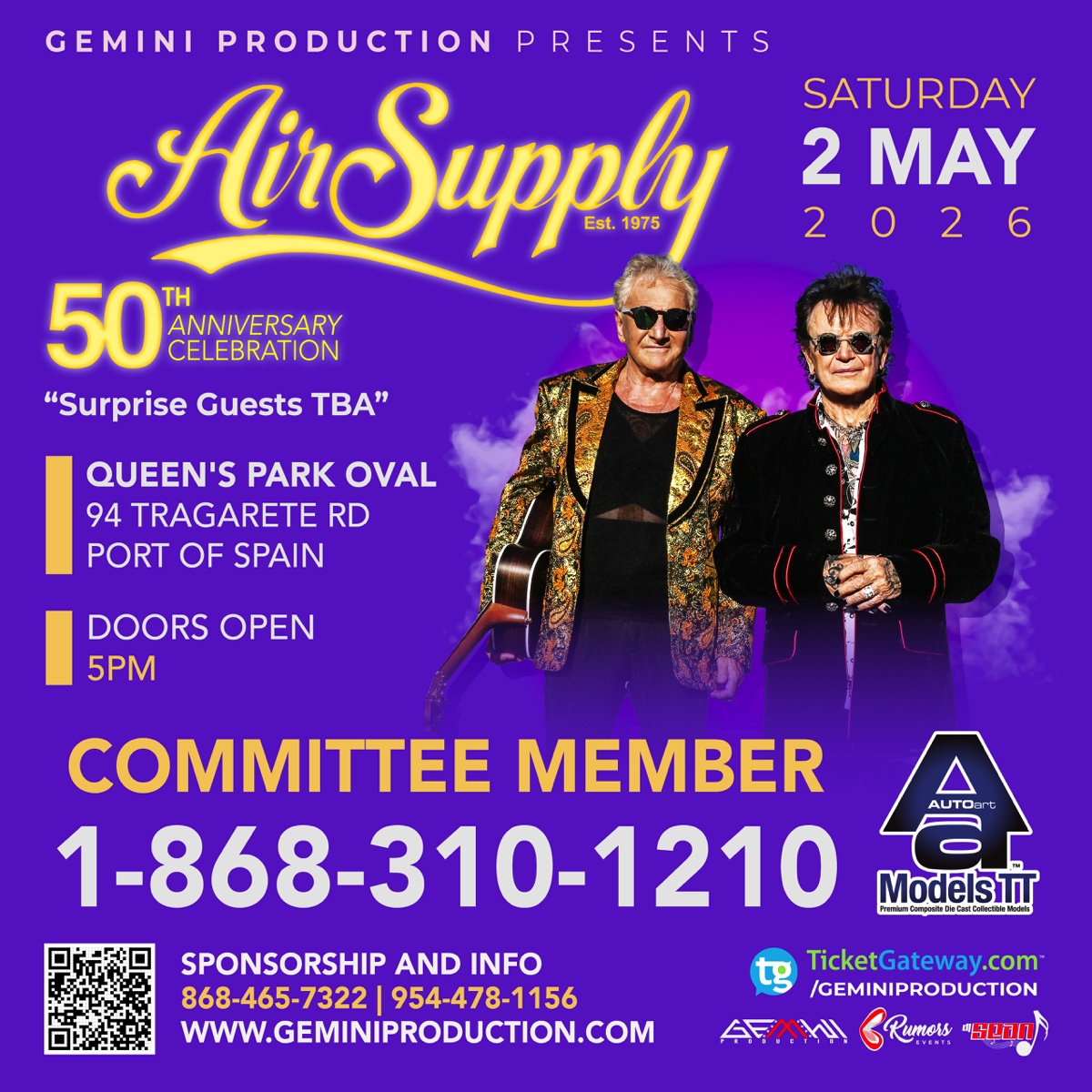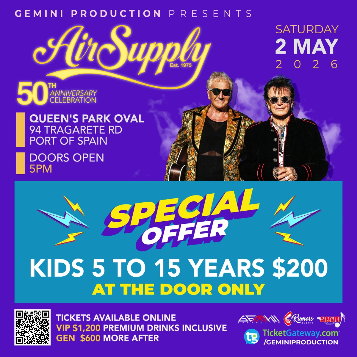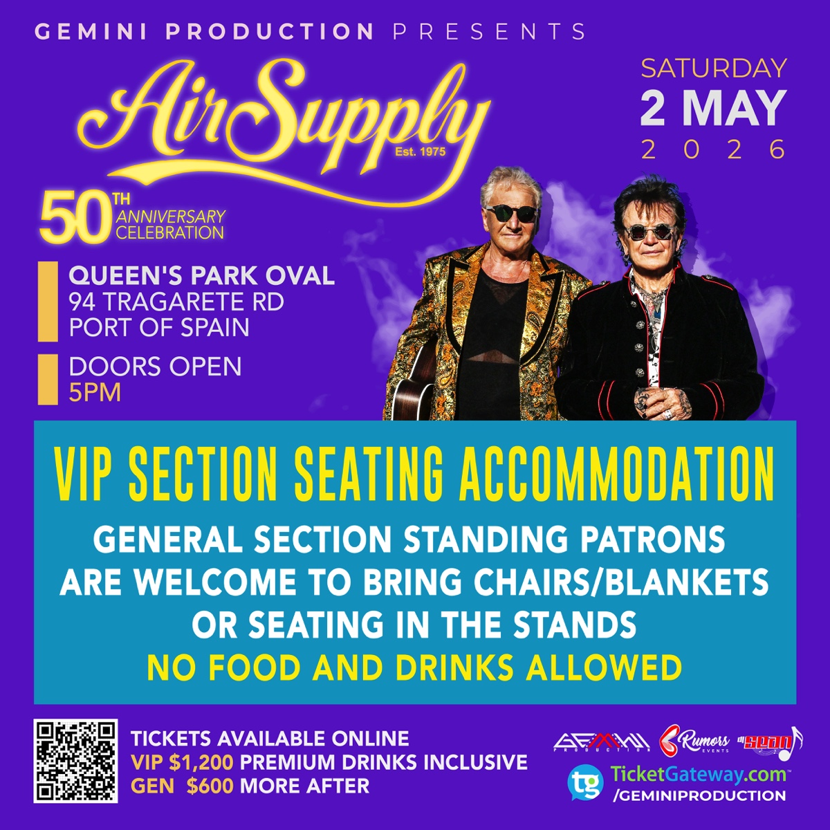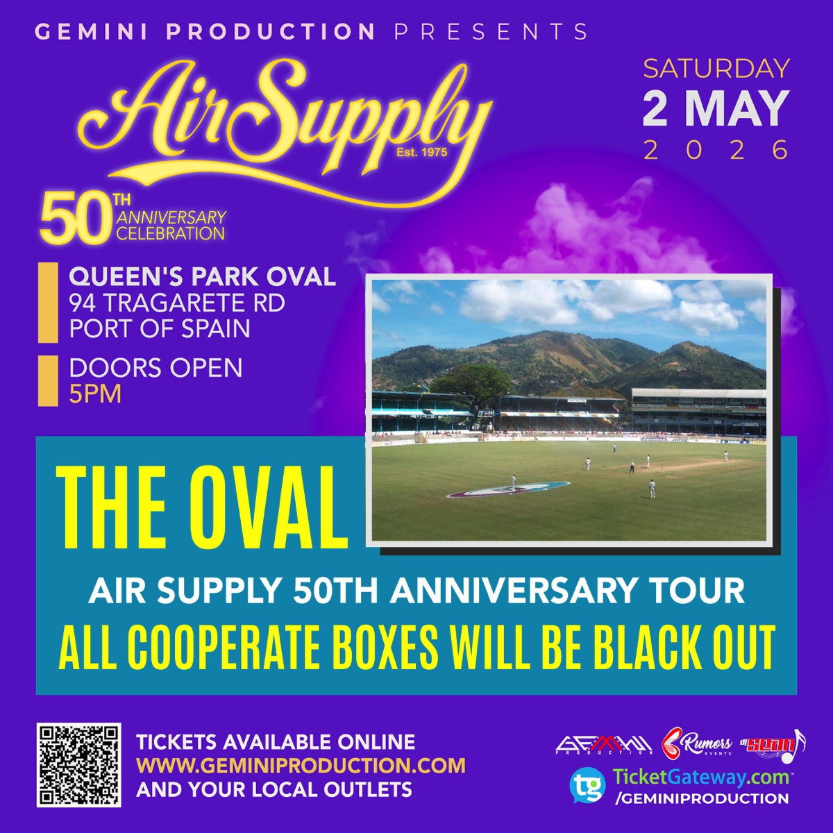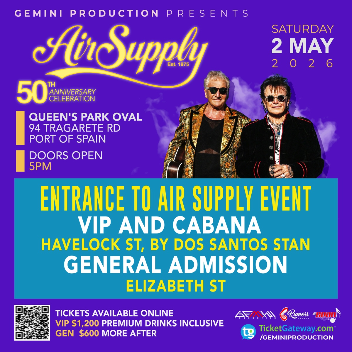 AIR SUPPLY • 50TH ANNIVERSARY CELEBRATION • SATURDAY 2ND MAY 2026 • QUEEN’S PARK OVAL • DOORS OPEN 5PM • TICKETS • PARKING • ENTRANCE • KIDS TICKET • HOTEL ACCOMMODATION • LEARN MORE •AIR SUPPLY • 50TH ANNIVERSARY CELEBRATION • SATURDAY 2ND MAY 2026 • QUEEN’S PARK OVAL • DOORS OPEN 5PM • TICKETS • PARKING • ENTRANCE • KIDS TICKET • HOTEL ACCOMMODATION • LEARN MORE •