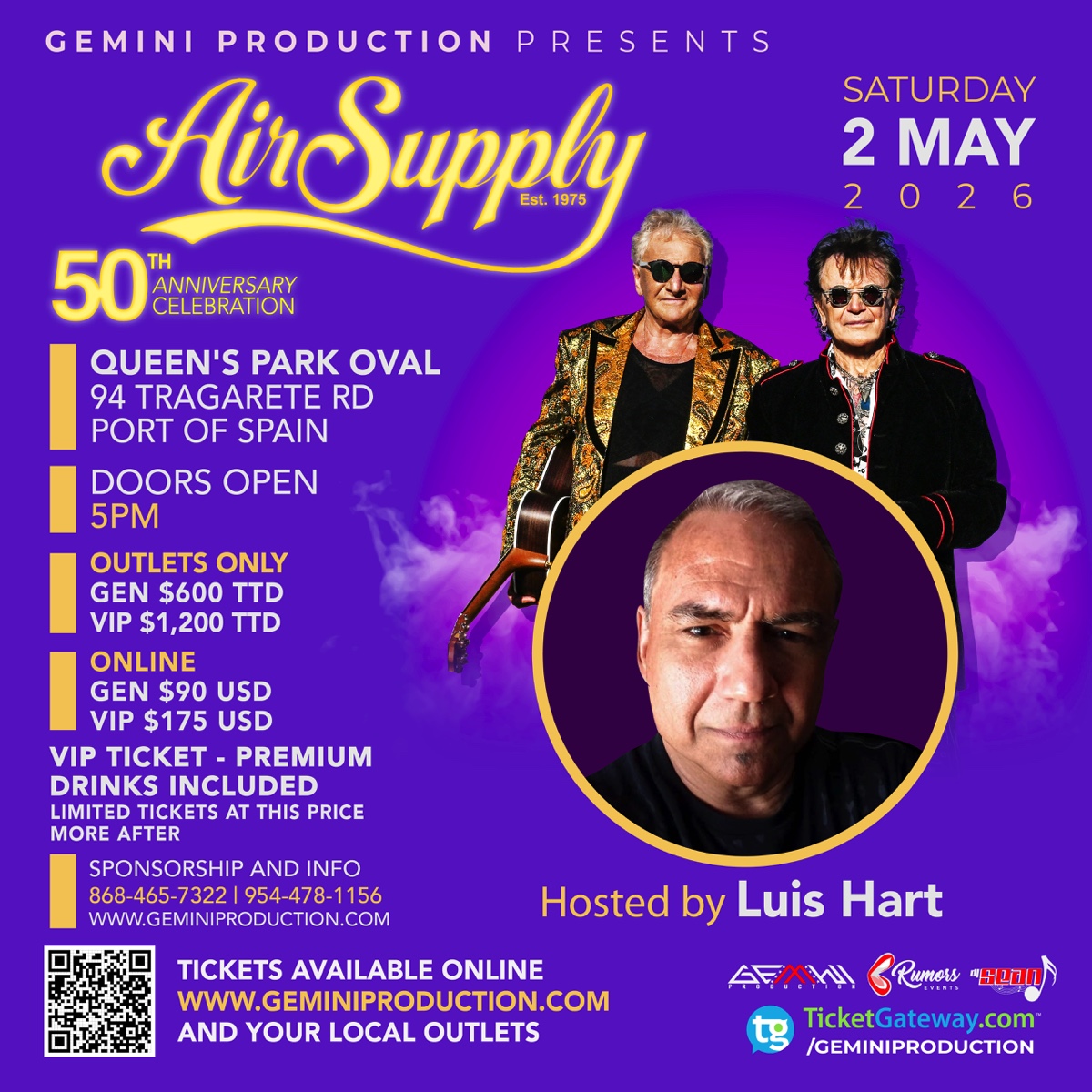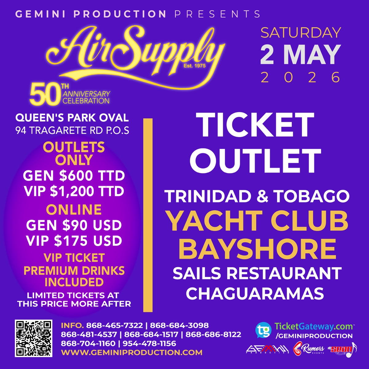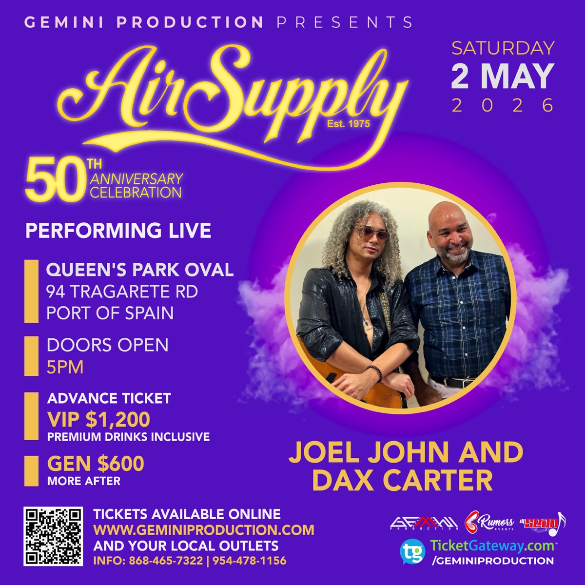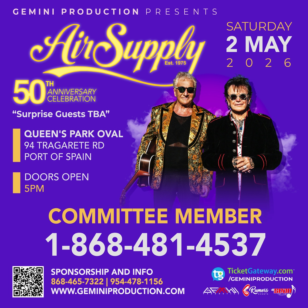 AIR SUPPLY • 50TH ANNIVERSARY CELEBRATION • SATURDAY 2ND MAY 2026 • QUEEN’S PARK OVAL • DOORS OPEN 5PM • TICKETS • PARKING • ENTRANCE • KIDS TICKET • HOTEL ACCOMMODATION • LEARN MORE •AIR SUPPLY • 50TH ANNIVERSARY CELEBRATION • SATURDAY 2ND MAY 2026 • QUEEN’S PARK OVAL • DOORS OPEN 5PM • TICKETS • PARKING • ENTRANCE • KIDS TICKET • HOTEL ACCOMMODATION • LEARN MORE •